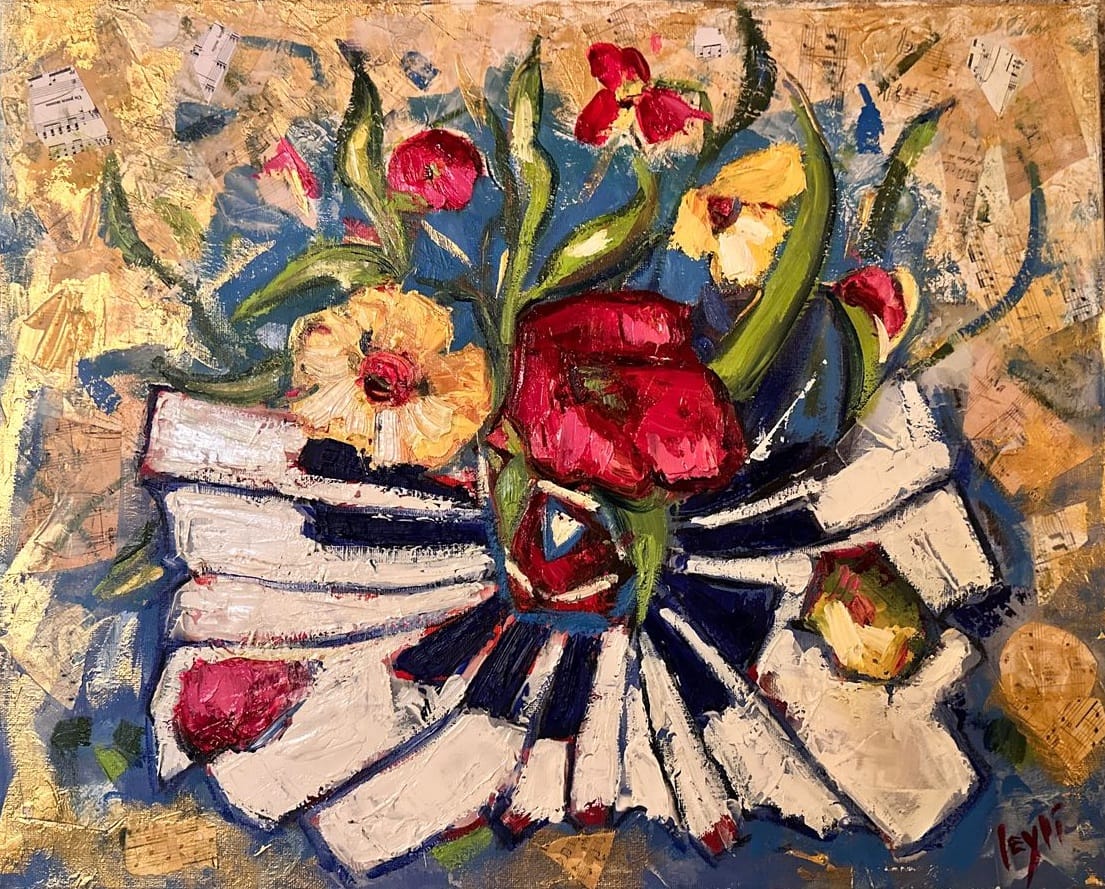 Абстрактное изображение пианино и цветов передаёт тонкую гармонию между музыкой и природой, создавая эмоциональную атмосферу через цвет и форму. Пожалуйста, уточните наличие у автора.