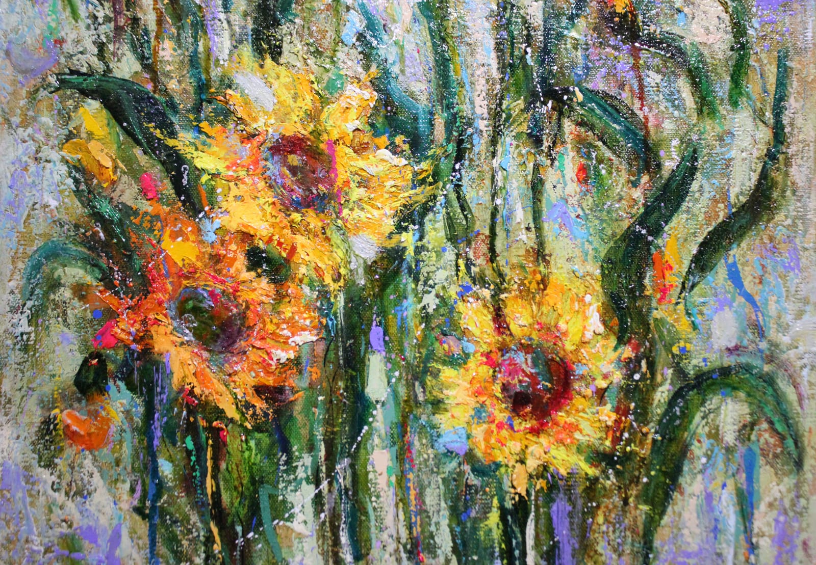 Kартина с подсолнухами выполнена в стиле импрессионизма и передаёт мимолётное впечатление света и цвета. Свободные и мягкие мазки оживляют жёлтые и золотистые оттенки, придавая цветам движение и выразительность. В целом работа создаёт ощущение тёплого солнечного момента и простой красоты природы.